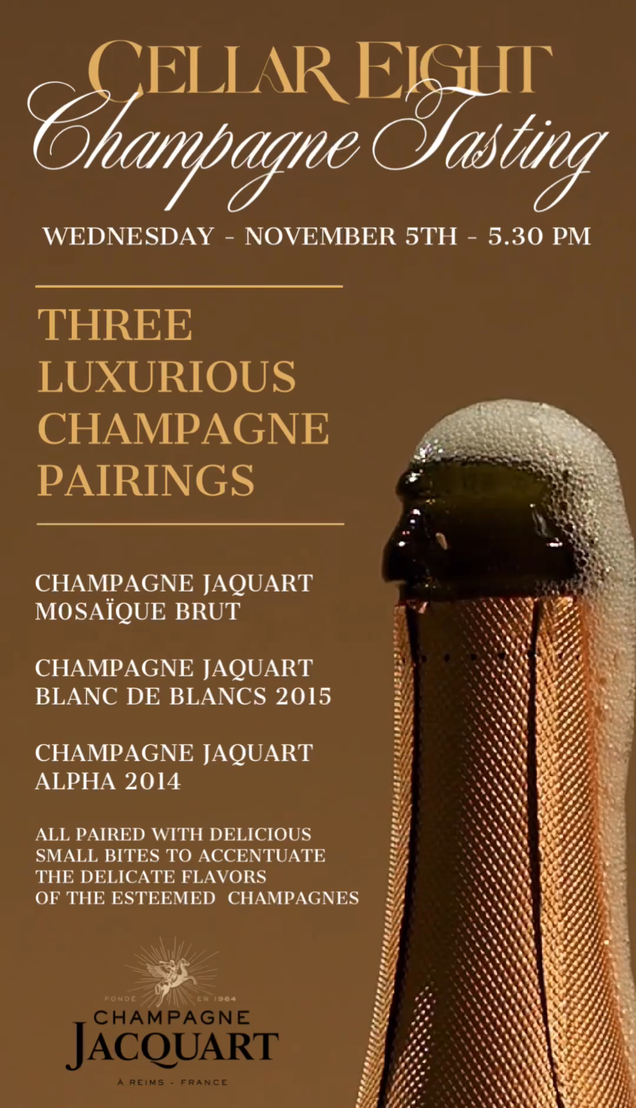 Join us on Wednesday, November 5th for an intimate dégustation of three distinguished cuvées from Champagne Jacquart, thoughtfully paired with artisanal charcuterie-inspired bouchées designed to highlight texture, acidity, and the elegant effervescence of true Champagne.