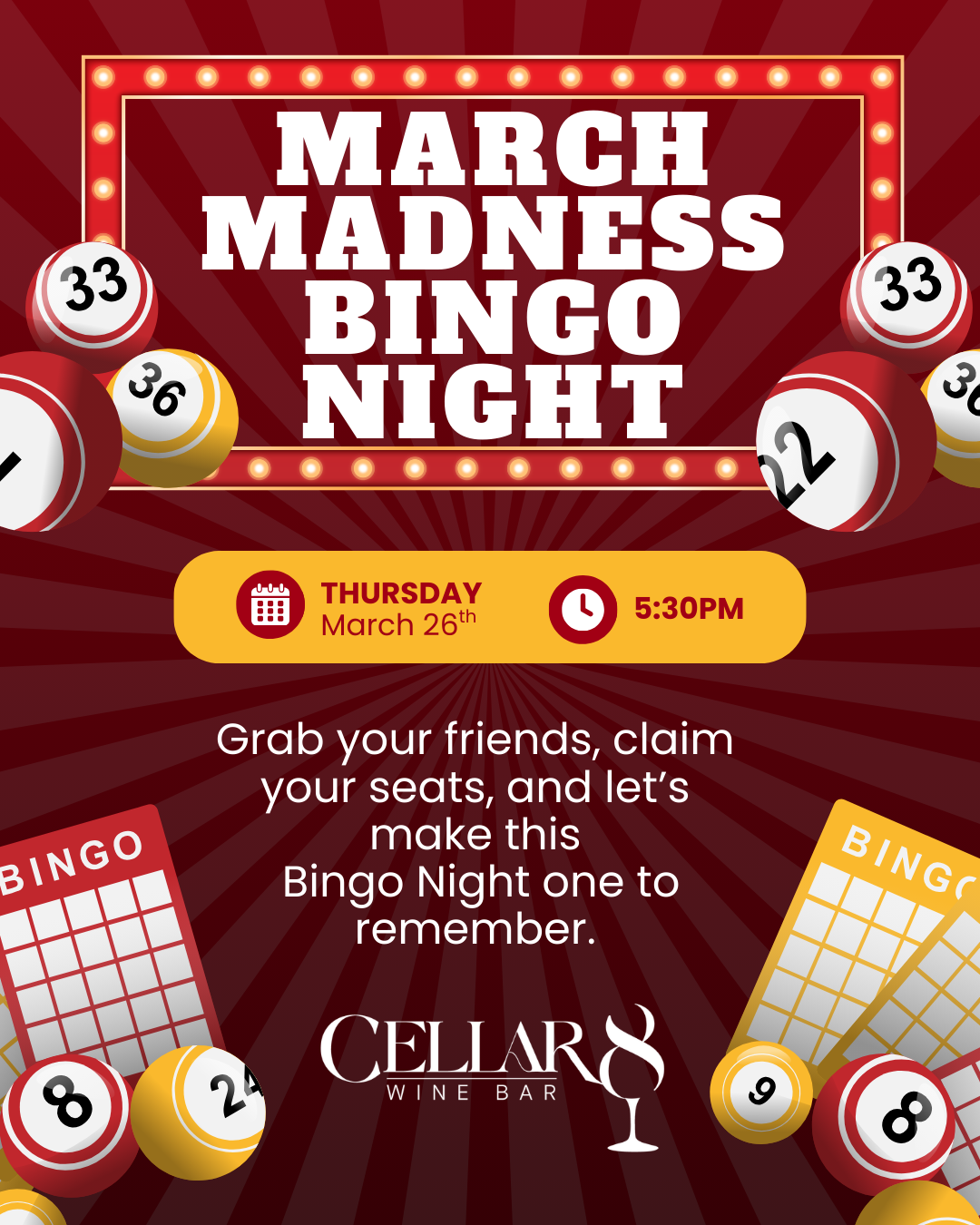 Join us for a little March Madness at Cellar 8 with a lively evening of Bingo, great wine, and good company.